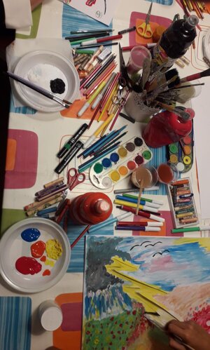 Matite, pastelli colorati, pennarelli, pastelli a cera ed a olio, gessetti, creta, tempere, acrilici, acquerelli, pennelli, fogli di carta di vari tipi e colori, cartoni e scatole, oggetti e materiali di riciclo. In atelier potrai trovare riviste per il collage, libri da macero, carte veline, crespe, nastri, fili…